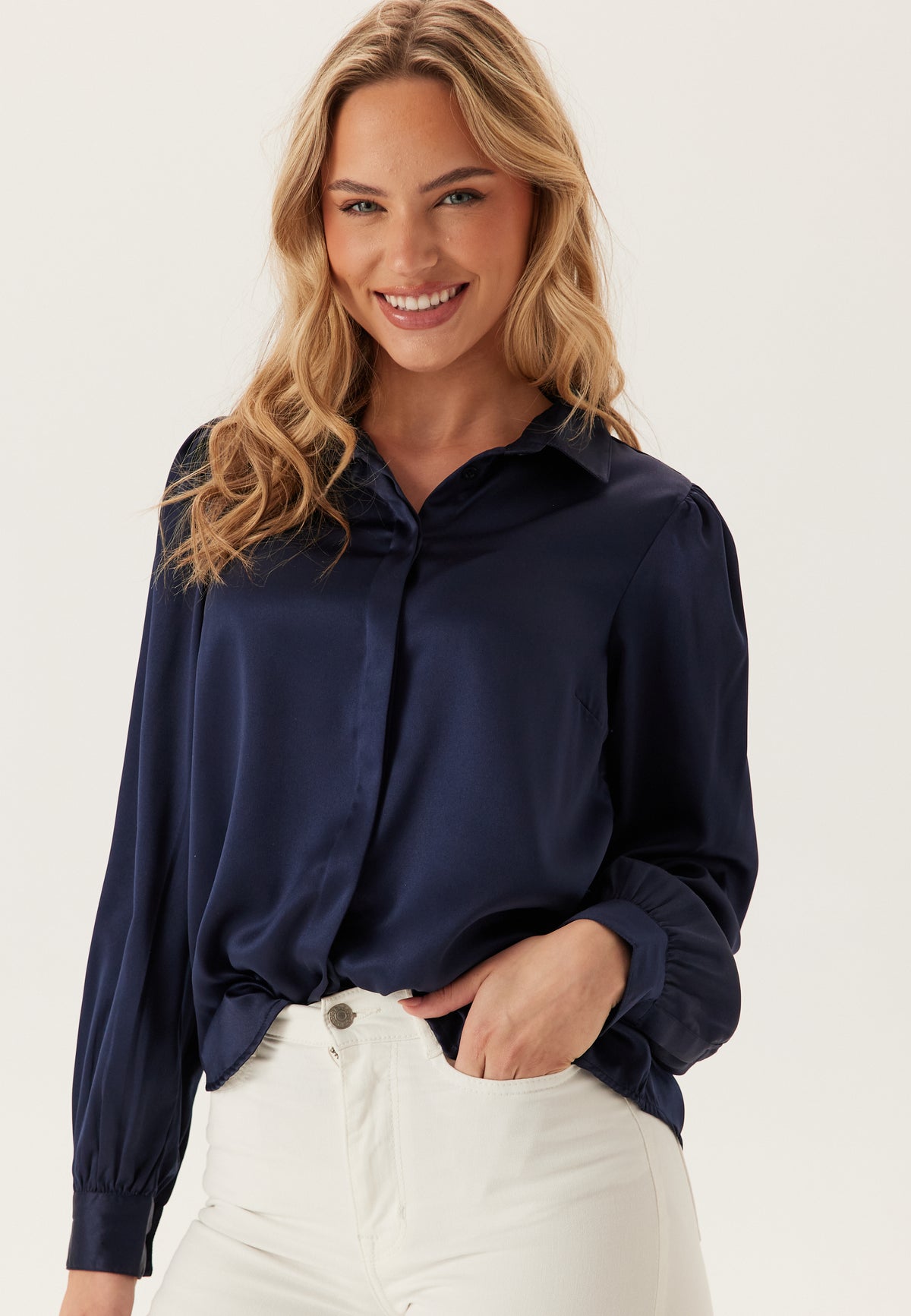 - Puff sleeves with single button cuffs on the sleeve ends